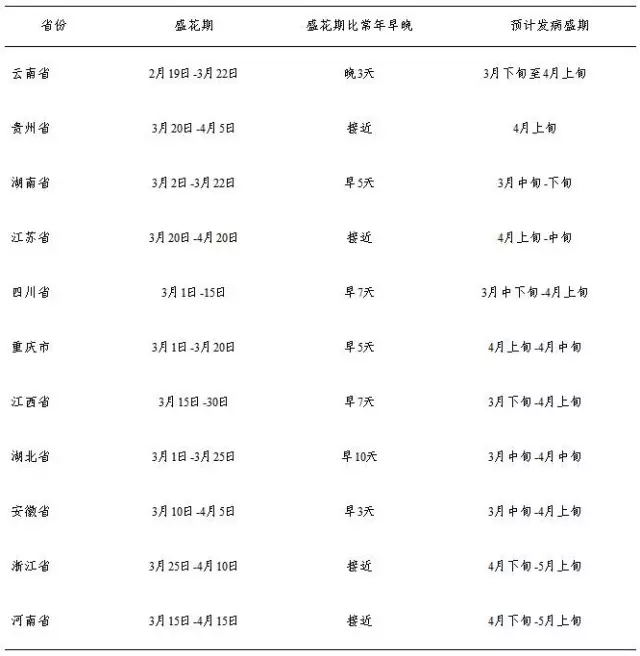 今年,長江流域冬油菜種植面積為9446萬畝,各省平均感病品種比率為65.9 %,比上年增加0.9個百分點。目前,云南、貴州、湖南、江西、湖北、安徽,以及浙江南部處于盛花期至花莢期,四川、重慶、江蘇、河南、陜西、上海,以及浙江北部處于始花期至盛花期,與上年同期相比,大部分地區花期比常年提早3-7天,最高提早10天,花器易感期與子囊孢子發生期相吻合時間長,有利于病菌侵染。預計各地花期和發病盛期見表2。
